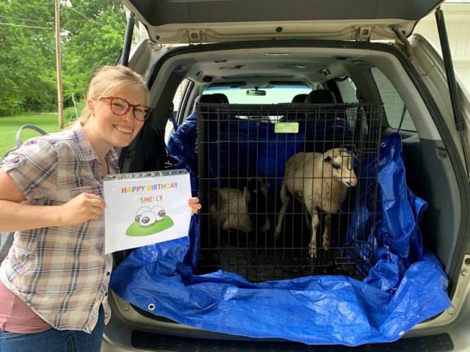 Jershon and I woke up and left our house a little before 8 am because we had to drive an hour to Holden, MO to get my birthday present… our first 3 sheep!! About a month ago Jershon told me that he wanted to get sheep for my birthday…which surprised me because I had come to terms that we probably wouldn’t be getting sheep this first year since we didn’t have fencing or a barn done and ready. But he decided to just speed up the process and get some fencing done and build a small shelter out of pallets for now.